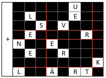 Die schwarzen Felder sind aus Karton, die Weißen sind ausgeschnitten. Am Anfang ist das Kreuz oben. Unser Text, der zu verschlüsseln ist, ist der folgende: „2.Raster: Diese Methode wurde im Buch Mathias Sandorf von Jules Verne erklärt.“ Wir nehmen jetzt unser Raster, legen es auf ein Blatt und fangen an, die Buchstaben hineinzuschreiben:
