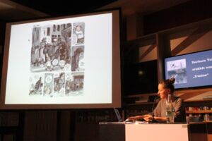 Wie auf den Fotos zu sehen ist, zeichnet Barbara Yelin überwiegend mit dunklen Farben und deutlichen Strichen und bringt damit die Sprachlosigkeit der Menschen und Härte der Zeit zum Ausdruck. Yelin zeigt uns Menschen, die nicht miteinander sprechen, weil der Staat es verboten hat, aber auch weil es so schwierig ist, schlimme Vorgänge zu benennen. Irminas Mann war in der SS. Als er in der Reichspogromnacht verschwunden war, sprach er nach seiner Rückkehr nicht über das, was er getan hat. Wo er gewesen sein könnte, seht ihr, wenn ihr euch den Comic anschaut. Er ist sicherlich bald in der Bücherei zu finden.