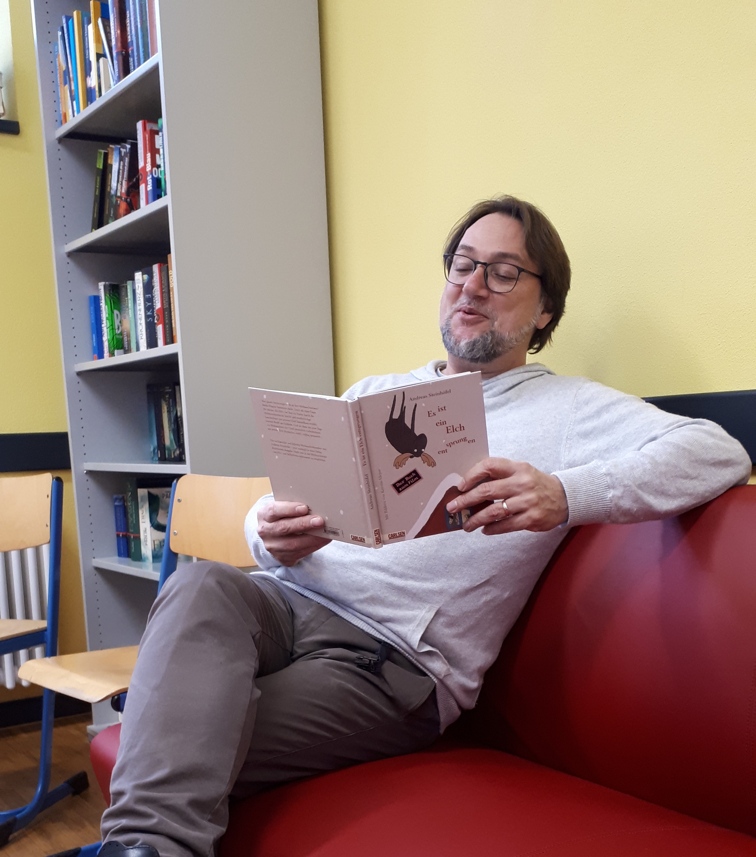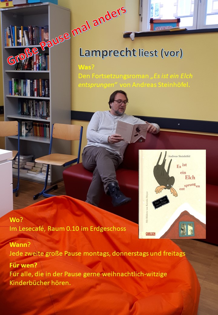 Für alle, die in der Pause gerne weihnachtlich-witzige Geschichten hören, setzt sich Herr Lamprecht montags, donnerstags und freitags in der zweiten großen Pause in den Raum 0.10 im Erdgeschoss beim Bücherschrank und liest aus dem Kinderbuch "Es ist ein Elch entsprungen" von Andreas Steinhöfel vor. Es dürfen alle kommen: Schülerinnen und Schüler aus Klasse 5 bis 7, aber auch ältere, die sich gerne etwas vorlesen lassen und die Pausen mal gemütlich erleben wollen. Man kann einfach kommen. Es beginnt am Donnerstag, dem 07.12., um 11.35 Uhr in Raum 0.10. Weitere Termine: Fr., 08., Mo., 11., Do., 14., Fr. 15., Mo., 18. und Do., 21.12., jeweils ca. 11.35 Uhr