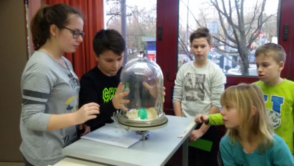 An meiner Station (Emely) gab es einen Luftballon, der sich selbst aufbläst. Wir hatten eine Flasche mit heißer Luft und haben den Luftballon über den Verschluss gezogen. Der Luftballon hat sich von selbst aufgeblasen, weil die Teilchen erwärmt wurden und dadurch mehr Platz brauchen. Wir hätten den Luftballon natürlich so auch platzen lassen können, aber das haben wir nicht gemacht.