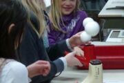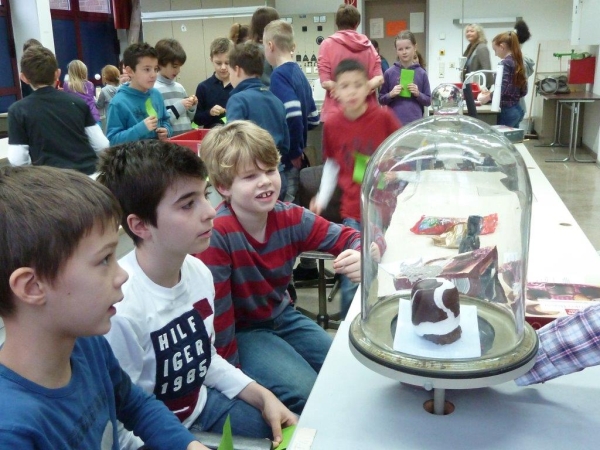Betreut wurden die insgesamt 14 Experimentierstationen in diesem Jahr von der 6c, deren Fachwissen und freundliche Ansprache seitens unserer Gäste ausdrücklich gelobt wurden. Auch diesmal drehte sich wieder alles rund ums Thema Luft: Wie atmen eigentlich Küken im Ei? Wieviel Luft passt in meine Lunge? Was passiert mit einem Schokokuss im Vakuum? Was ist eigentlich flüssige Luft?