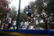Es war schön warm, sprich: viel zu heiß, an die 40 Grad und es gab einen Pool, der für uns aber nicht in Frage kam, weil man da Badekappen tragen musste. Da es daneben aber auch Trampoline gab, war es in unserer Freizeit sehr lustig.