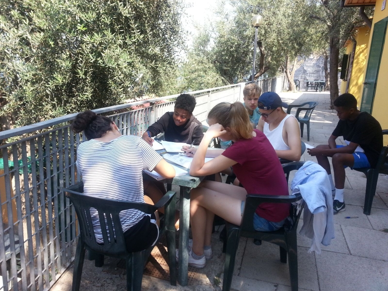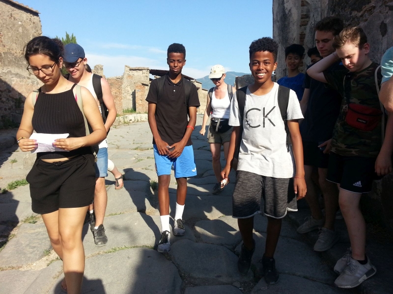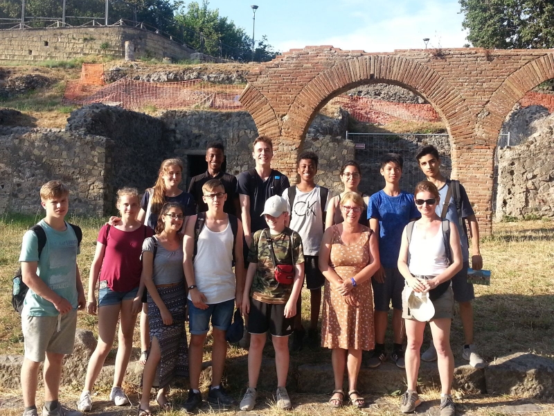 Wir kamen in unseren Bungalows an und sind am nächsten Tag mit einer kleinen Bahn, der Circumvesuviana, nach Pompei gefahren und haben diese Ruinen-Stadt besichtigt. Es war sehr beeindruckend durch die Straßen zu laufen und sich vorzustellen, wie die Menschen früher gelebt haben. Danach haben wir an bestimmten Orten in Pompeji: Theater, Thermen, Amphitheater, Gräberstraße, unsere Referate vorbereitet, die wir am Freitag vortragen müssen. Anschließend sind wir wieder zu den Bungalows gefahren und sind nach dem Abendessen zum Meer gegangen, um unsere Füße ins Wasser zu halten:) (Vanessa Schwanz, 8b)