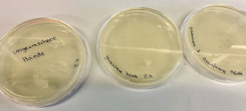 Zwischendrin haben wir ein kleines Experiment gemacht, in dem wir mit ungewaschenen, gewaschenen und desinfizierten Händen jeweils einen Nährboden kontaminiert haben. Über Nacht lagerten die Petrischalen im Brutschrank und am nächsten Tag waren tatsächlich Bakterienkulturen sichtbar. Je sauberer die Hände, desto weniger Bakterien waren auf dem Nährboden gewachsen. (Foto: Experiment)