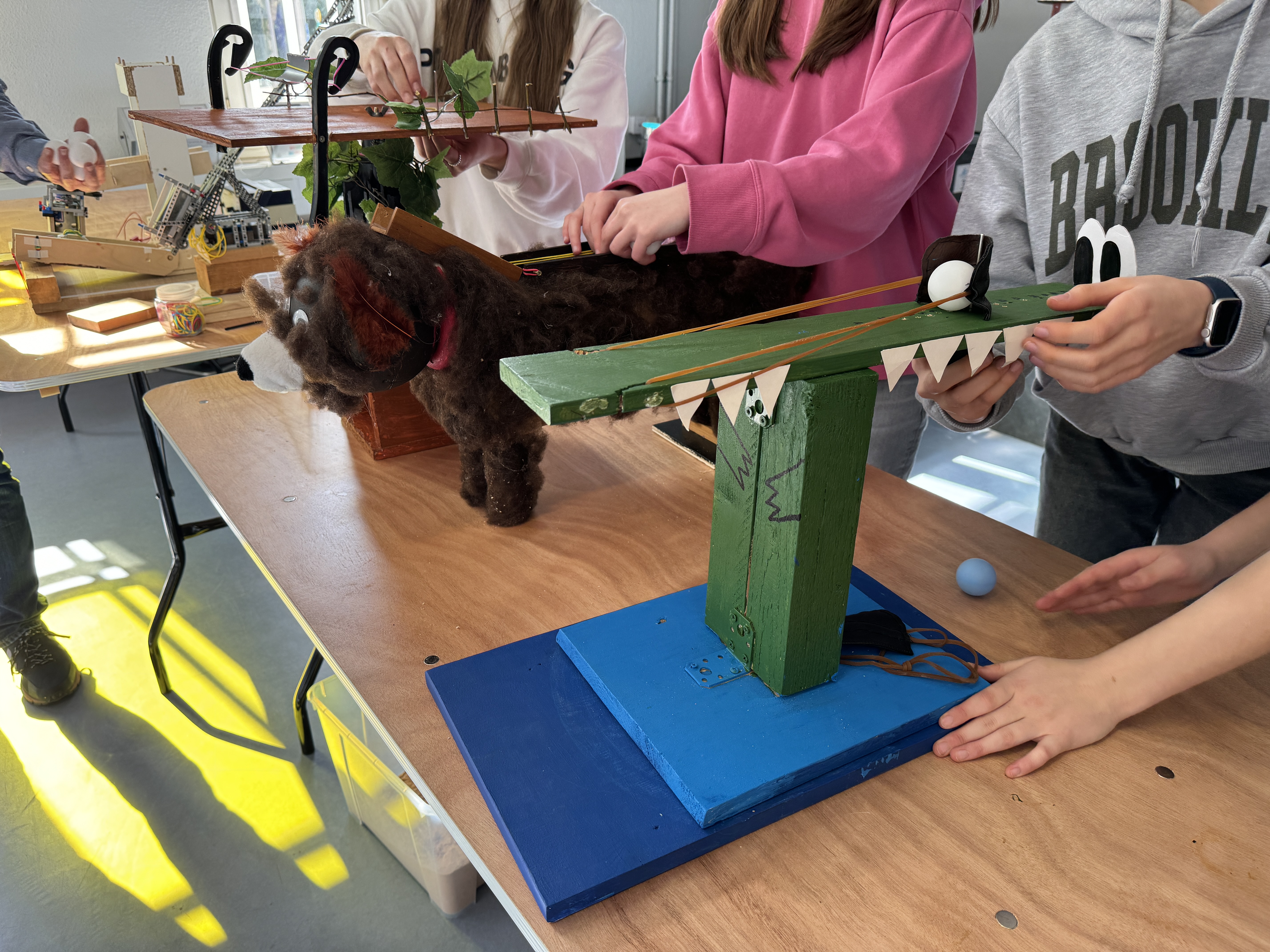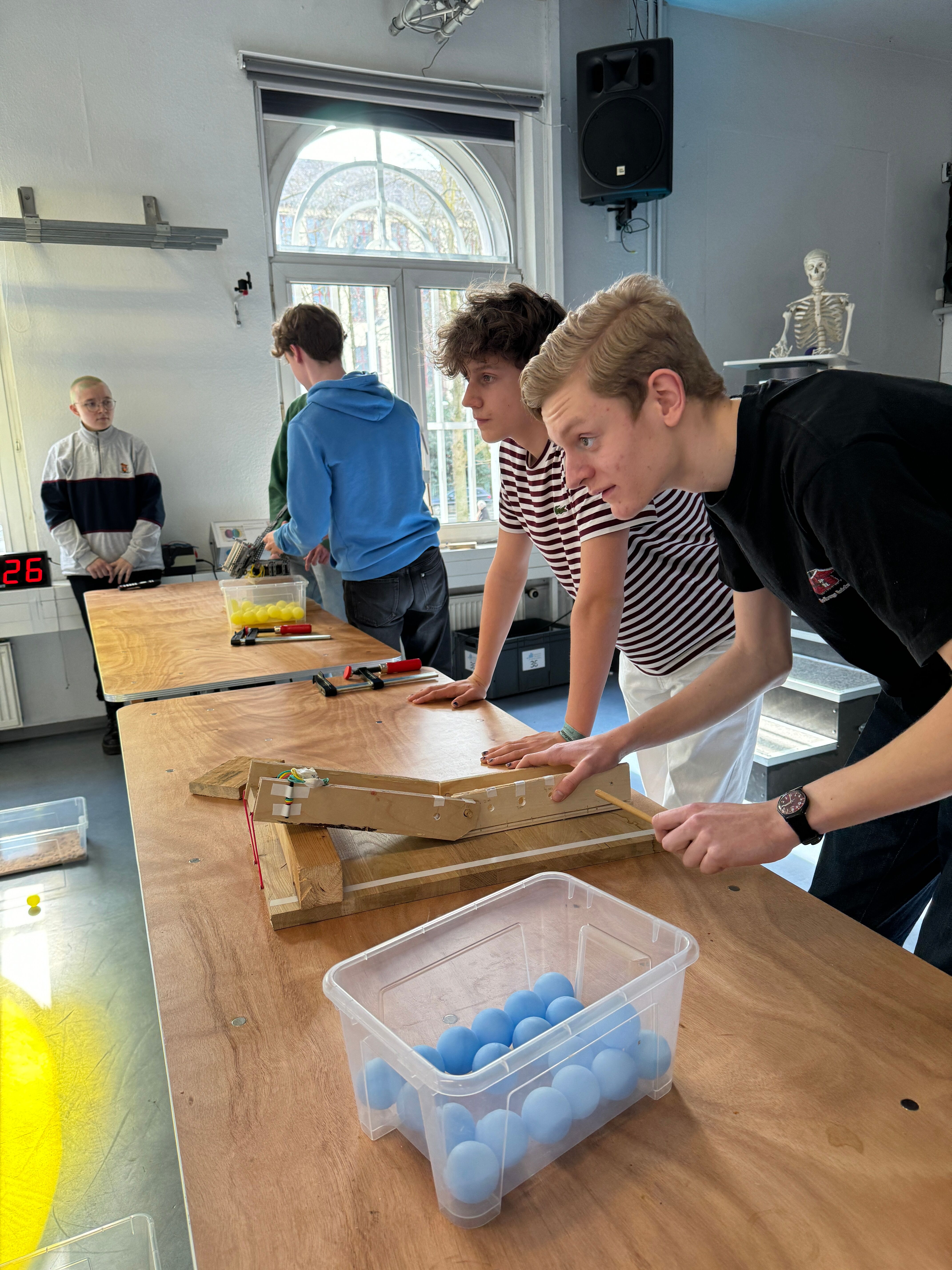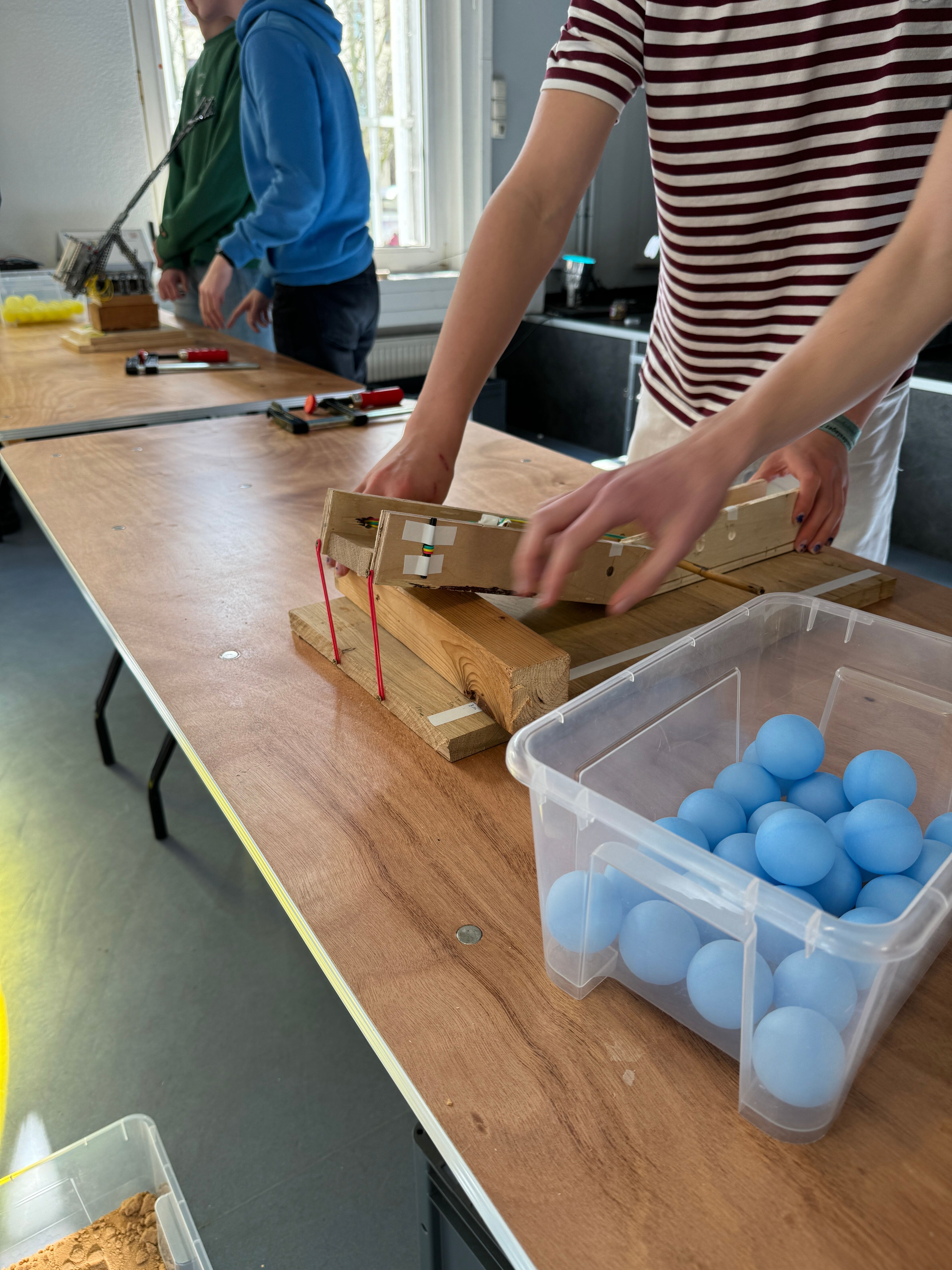 Dazu haben wir ab November 2023 in 2-er- bis 4-er-Gruppen Maschinen aus nachhaltigem und/oder recycelten Material gebaut, die einen Tischtennisball 1-4 Meter weit schießen können.