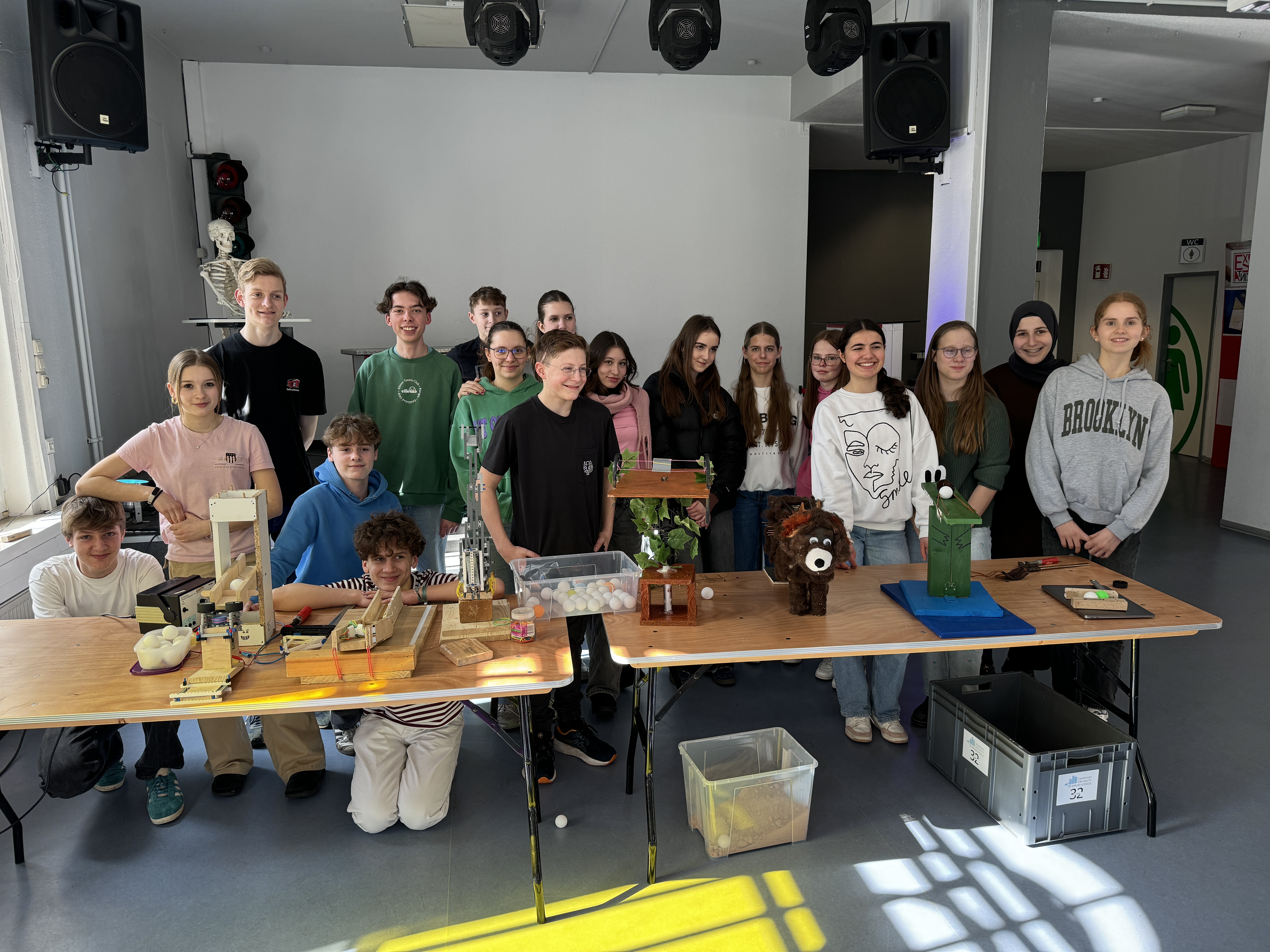 Bei dem Wettbewerb, an dem jeweils 3 Gruppen der 9. und 3 Gruppen der 10. Klasse teilnahmen, mussten mithilfe der selbstgebauten Maschinen innerhalb von 3 Minuten so viele Tischtennisbälle wie möglich in vor den Maschinen aufgebaute Behälter geschossen werden. Es gab für jedes Team 5 Behälter und pro Runde maximal 25 Bälle zur Verfügung. In den Vorentscheiden der 9. und 10. Klasse traten jeweils 2 Teams mit ihren Maschinen gegeneinander an. Daraufhin ist der Sieger der 9. Klassen gegen den Sieger der 10. Klassen angetreten. Mit Stolz können wir sagen, dass das Team „Rufus“ aus der 9. Stufe diesen Wettbewerb gewonnen hat. Trotzdem gilt ALLEN Teilnehmer*innen ein herzlicher Glückwunsch zu ihren tollen Leistungen und ein riesengroßer Dank an Hrn. Stietzel und Hrn. Katzenberger, die uns nicht nur beim Wettbewerb, sondern auch bei allen Fragen rund um den Bau immer super geholfen haben.