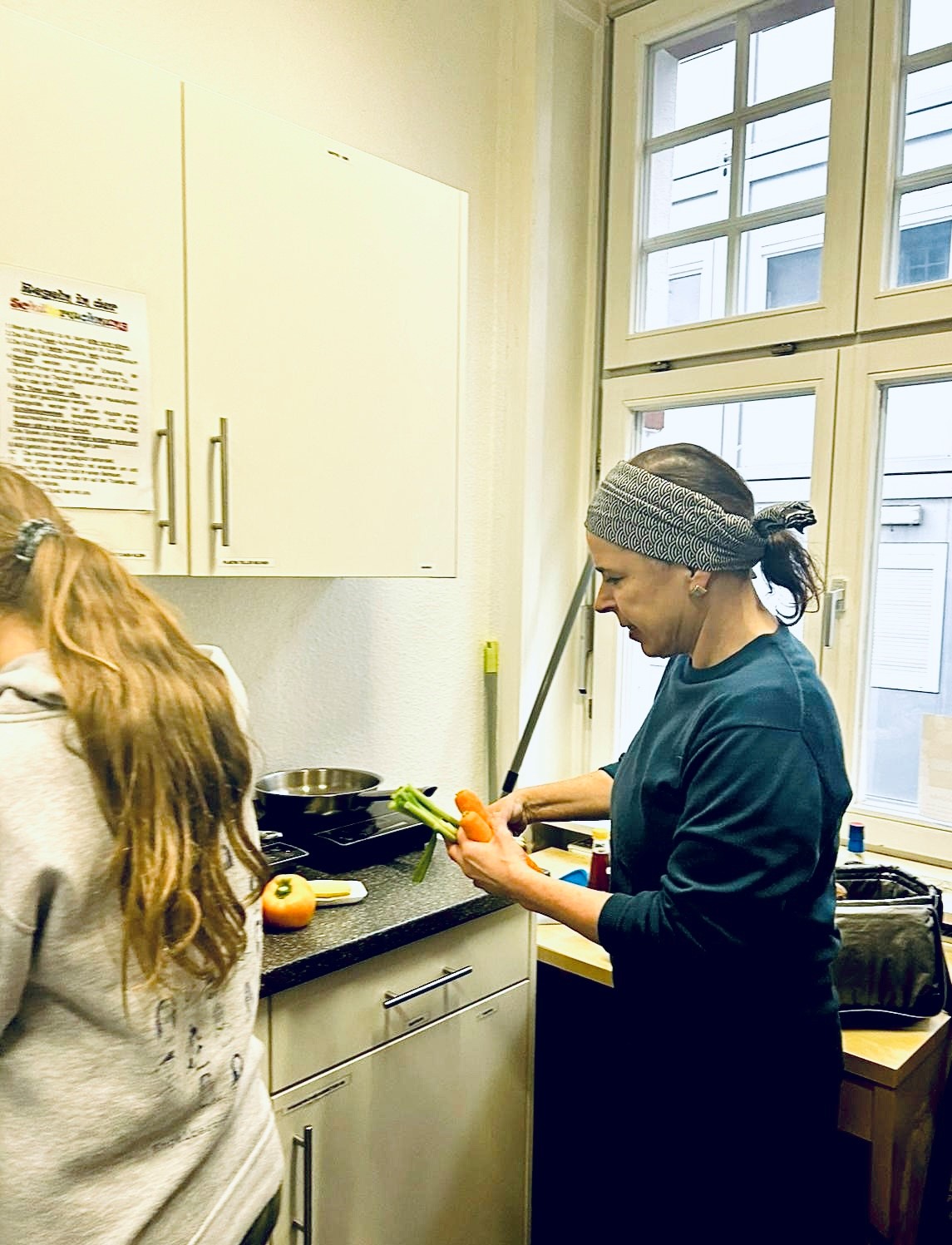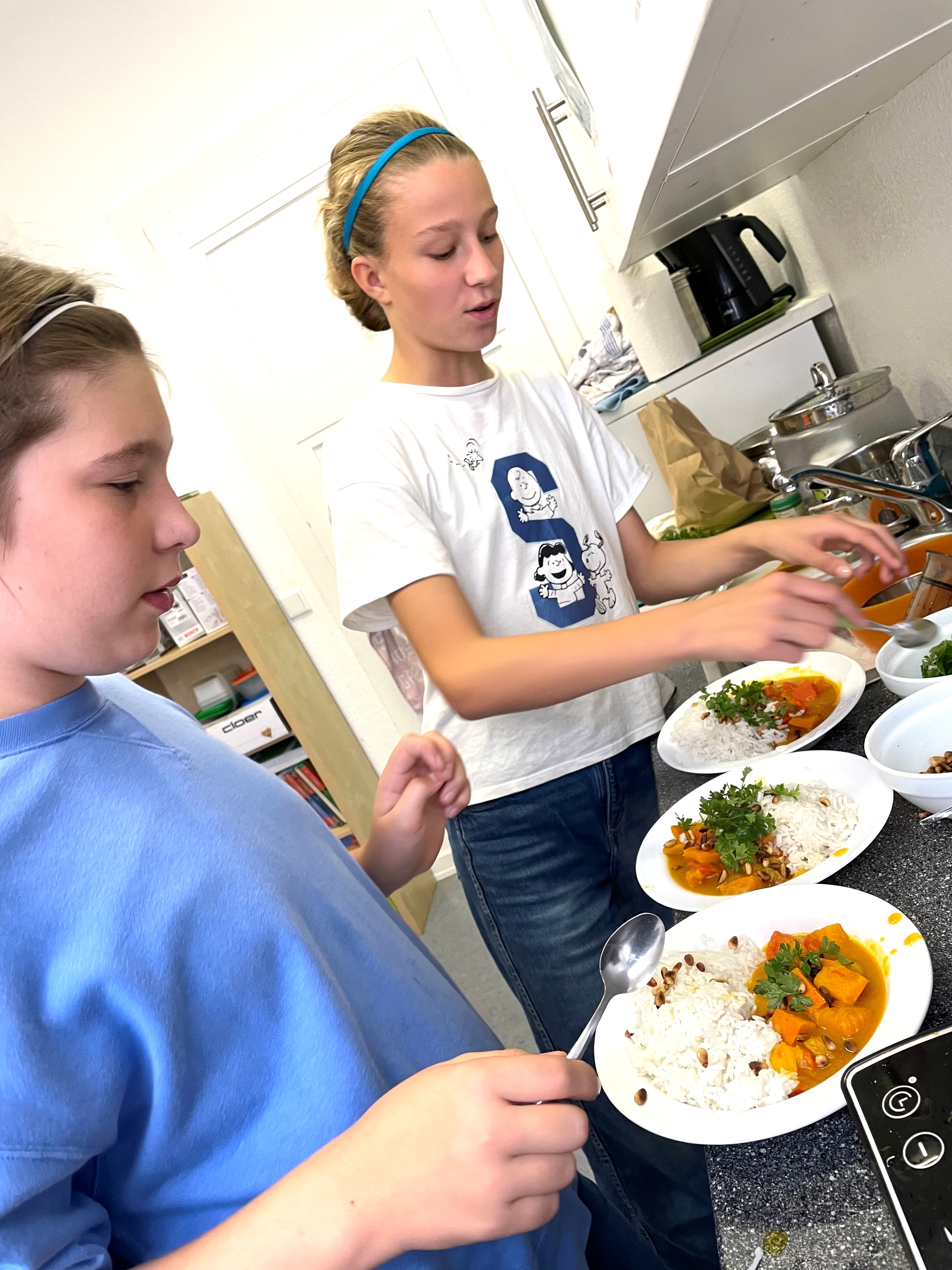 Jeden zweiten Montag traf man sich dort und konnte neue Erfahrungen sammeln: Rezepte aussuchen, mitentscheiden, selbst tätig werden und dabei auch noch neue vegetarische Rezepte kennenlernen. Das war das Konzept des AG Angebots, das auf Initiative von Kiki Brodmerkel, einer Mutter aus den Reihen der Elternschaft der Elisabethenschule, erfolgreich umgesetzt werden konnte.