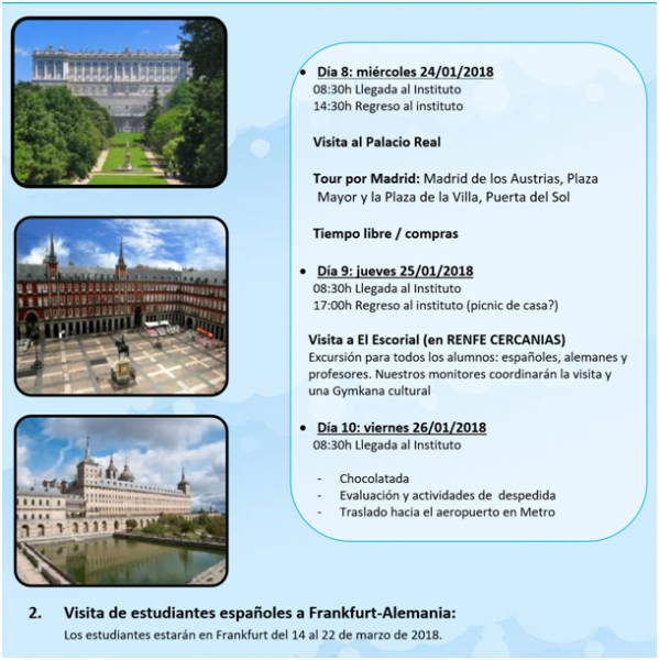 Vom 17.- 26.01. sind 53 Schüler der 7. Klassen in Madrid in Gastfamilien untergebracht, um die spanische Sprache und Kultur hautnah zu erleben. Vier Lehrkräfte begleiten die Schüler vormittags durch die faszinierende Hauptstadt Spaniens.