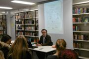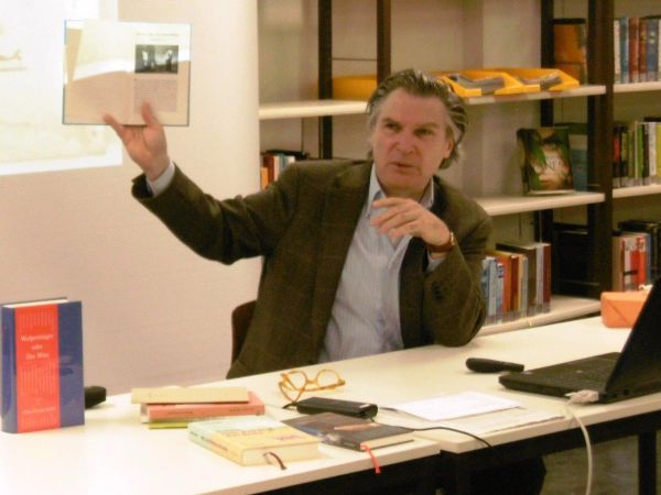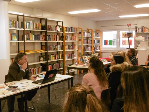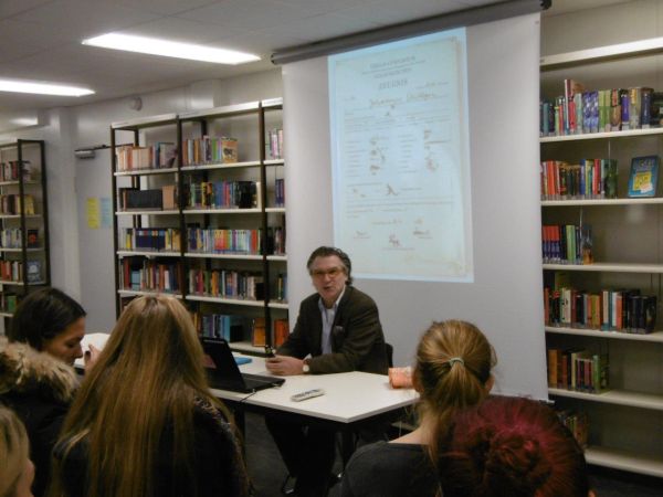 Axel Dielmann veranschaulichte seine Lesung durch Bilder der erwähnten Kunstwerke, woraus sich ein lebendiger Gedankenaustausch zwischen Autor und Publikum über das (Un-)Vollkommene in der Kunst entspann. Ebenso interessierten sich die Schülerinnen und Schüler für den persönlichen Werdegang des Autors, der sich erst nach einem anfänglichen Studium der Physik vollends der Literatur zuwandte. Sie erhielten bereitwillig Einblicke in die Arbeit des Verlegers und des Lektors und manchen persönlichen Tipp zu ihrer eigenen bevorstehenden Berufswahl. Von seinen jungen Zuhörern war Axel Dielmann sehr angetan, er fand sie, „in ihrer Klarheit und Direktheit als Gesprächspartner ganz wunderbar.“