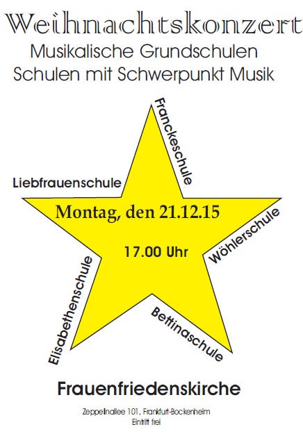 Am Montag, den 21. Dezember 2015 findet das diesjährige Weihnachtskonzert der Elisabethenschule zusammen mit vier weiteren Schulen in der Frauenfriedenskirche in Bockenheim statt. Ihr seid herzlich eingeladen! Der Eintritt ist frei! Um 17 Uhr geht´s los.