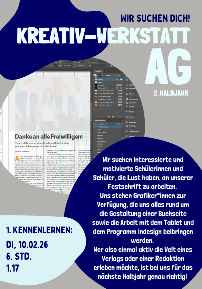 Wir suchen interessierte und motivierte Schülerinnen und Schüler, die Lust haben, an unserer Festschrift zu arbeiten. Uns stehen Grafiker*innen zur Verfügung, die uns alles rund um die Gestaltung einer Buchseite sowie die Arbeit mit dem Tablet und dem Programm indesign beibringen werden. Wer also einmal aktiv die Welt eines Verlags oder einer Redaktion erleben möchte, ist bei uns für das nächste Halbjahr genau richtig!