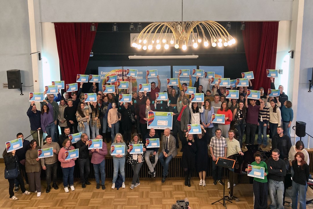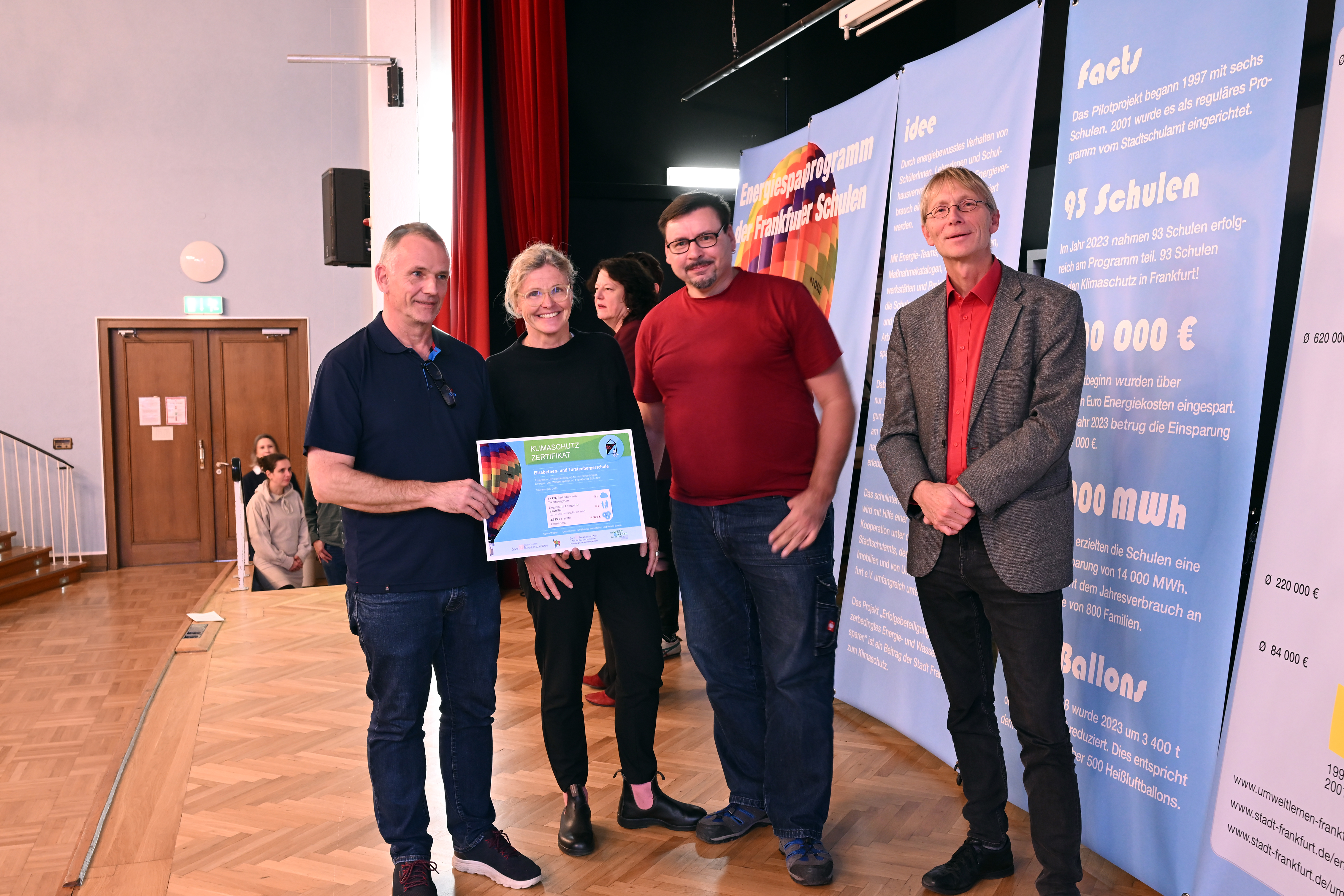 Um zu sehen, ob sich unsere Aktivitäten lohnen und wie wir auch im Vergleich mit anderen Schulen dastehen, gehen wir regelmäßig auf die Prämienfeiern der Frankfurter Schulen im Energiesparprogramm und nehmen dort unsere Energiesparprämie für das vergangene Jahr entgegen.